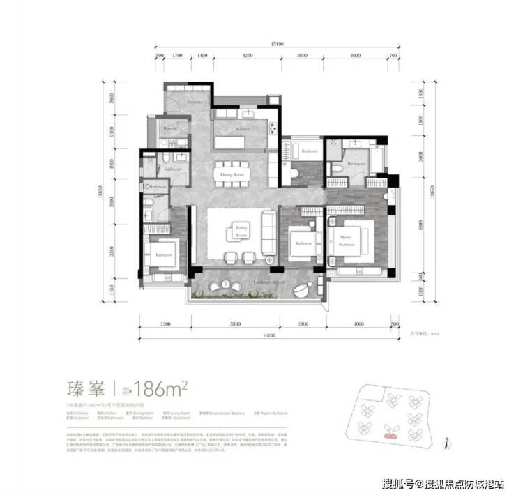 186㎡顶复:专梯专户,270°转角阳台,南向一线花地湾河涌景观,LDKB洄游路线(超80㎡多功能巨幕宽厅),超40㎡端厅套房主卧(配备独立书房、衣帽间、五件套卫浴),总价1100万-1200万元(享9折优惠后)。