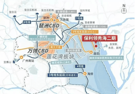 虽然目前主要依赖自驾,但保利领秀海的交通配套未来可期。自驾方面,出门即南大干线,转新化快速可直达大学城、琶洲,无缝衔接万博 CBD 与广州南站等核心枢纽。公共交通方面,距离项目 4 公里左右的莲花山站已开通佛莞、佛莞深两条城轨,3 站可达万博、4 站直达广州南站,2 站到大学城、3 站到琶洲,跨区通勤高效便捷,规划中的广中珠澳城轨更将进一步拓展出行半径。更令人期待的是,地铁 8 号线东延线(莲花湾至万胜围)预计 2027 年底通车,全程 8 个站,届时从莲花湾到海珠仅需 20 分钟,彻底打通板块与中心区的快速联系。