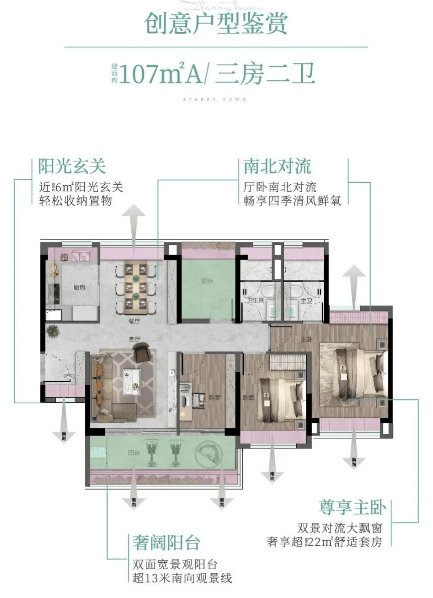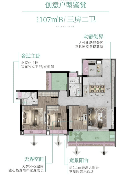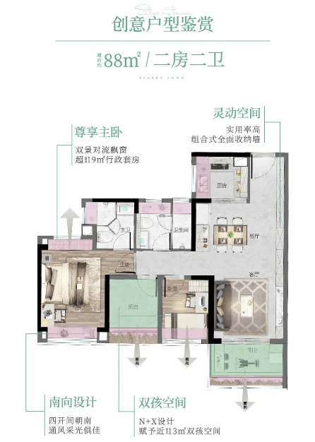 88㎡ 3空间2厅2卫:罕见四面宽小户型,三卧室朝南,超11米景观线,精细化收纳设计。
