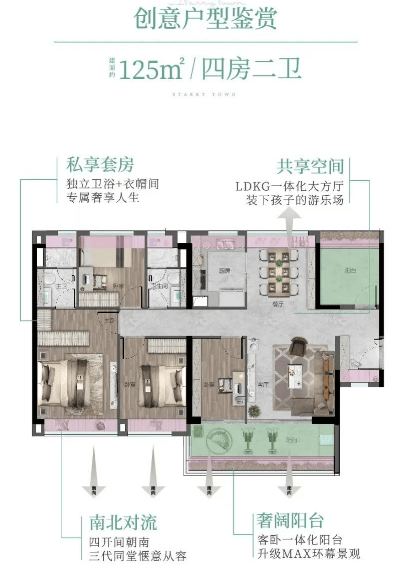 125㎡ 5空间2厅2卫:4.5开间朝南,客餐厅南北对流,舒适阳光宅,双面宽观景阳台,实用率超高。