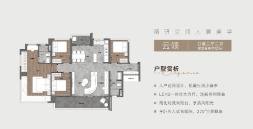 建面约121㎡与143㎡四房两厅两卫户型,则更注重改善型需求。大面宽客厅、全景阳台,让视野更加开阔;主卧套房设计,配备独立卫浴与观景飘窗,提升居住品质;部分户型还设有入户花园,增加了空间的层次感与实用性。