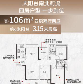 106㎡户型:4 房 2 厅南北对流单边位