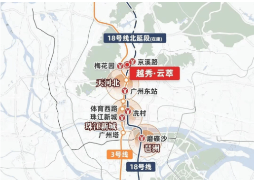 交通体系方面,项目周边已形成多层级立体出行网络。轨道交通是区域的重要支撑之一,现有与规划线路共同构建起连接珠江新城、天河北、琶洲及城市南北门户的快速通道。对于高频通勤人群而言,该区域在通勤效率与出行选择上具备较强的确定性。