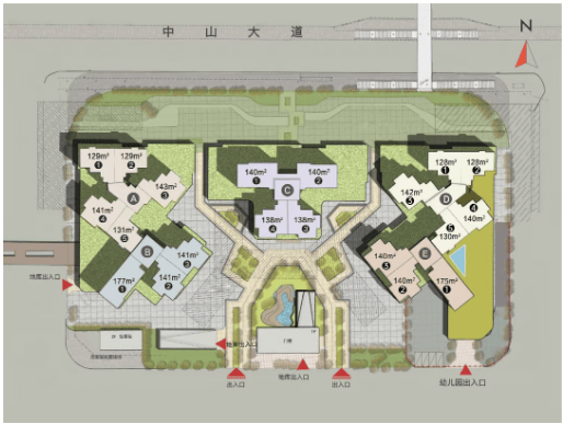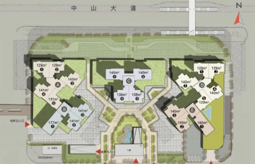 塔楼设计:共建5栋塔楼,每栋32层高。北向房间临近中山大道,可能受到一定噪音影响;南向则望小区花园,较为安静。