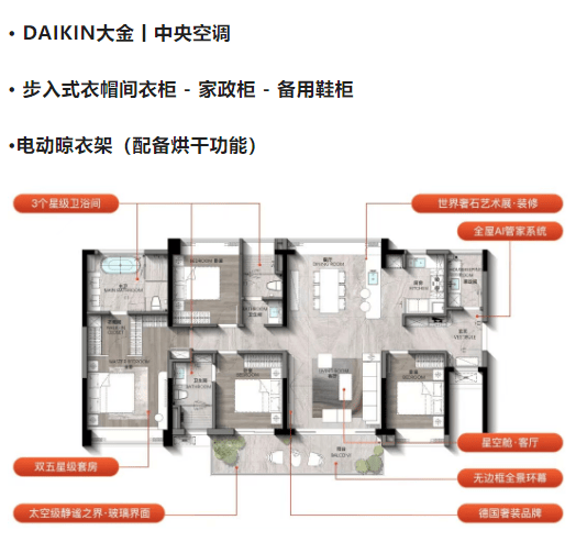 智能家居:全屋新风系统,大金中央空调,步入式衣帽间等配置,提升居住品质。