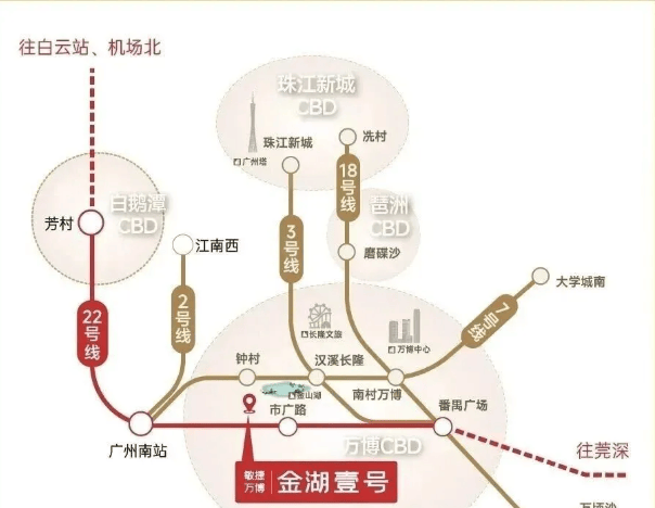 敏捷·万博金湖壹号靠近地铁22号线和26号线交汇的市广路站,距离站点仅约800米。22号线时速高达160公里,可快速通达广州南站、白鹅潭商圈、白云机场等重要区域;而26号线则相当于3号线的姐妹线,能够便捷到达体育西、珠江新城等地。