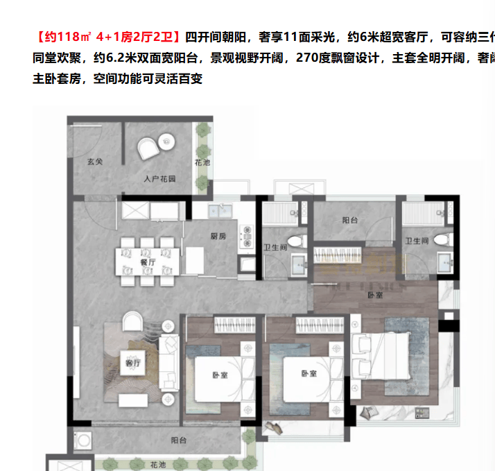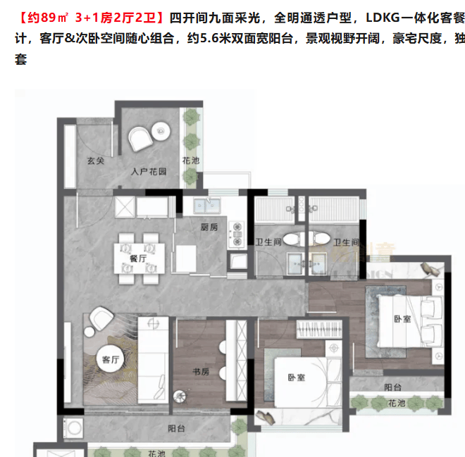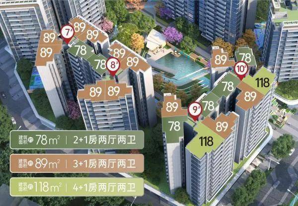 像约 78㎡的 2 + 1 房 2 厅 2 卫户型,四开间采光,全明通透,LDKG 一体化客餐厨灵动设计,客厅与次卧空间可随心组合,约 5.5 米双面宽阳台,景观视野开阔,还有独立主套。约 89㎡的 3 + 1 房 2 厅 2 卫户型,四开间九面采光,同样 LDKG 一体化,约 5.6 米双面宽阳台。约 118㎡的 4 + 1 房 2 厅 2 卫户型,四开间朝阳,奢享 11 面采光,约 6 米超宽客厅,约 6.2 米双面宽阳台,270 度飘窗设计,主套全明开阔,空间功能灵活百变。
