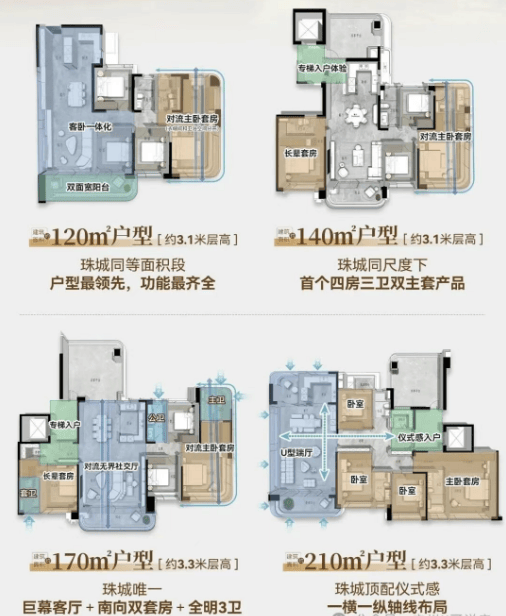 T2板楼:主力户型为120-210平方米的四房设计,采用正南北全T2板楼设计,保证了通风、采光和景观的最大化。