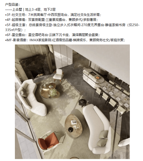 金茂越秀|璞樾·墅精准把握塔尖人群的居住需求,打造约210-550㎡新规纯墅户型,涵盖上合墅、下合墅两大产品形态,全明通透设计,户户兼具景观视野与空间奢适感,得房率超传统大平层30%,赋能塔尖理想人居,预计2027年交付含全精装赠送,样板间已实景呈现。上合墅规划地上3-4层、地下2层,空间布局科学合理,兼顾社交与居住需求。3层打造7米挑高客厅与中西双厨岛台,成为高端社交主场,可满足商务宴请、家庭欢聚等多元场景;4层设置双套房与三重景观露台,兼顾多代、多胎家庭的奢居需求,私密与舒适兼具;5层超级主套采用总统套房级设计,配备独立步入式衣帽间、270度无界露台与静谧茶烟书房(仅250-335㎡户型),彰显主人尊贵身份;6层星空露台打造星空酒吧岛台与云端下沉卡座,是圈层聚会、休闲观景的绝佳场所;地下层规划IMAX家庭影院、红酒雪茄品藏区与棋牌娱乐区,兼顾商务社交与家庭欢聚。下合墅规划地上2层、地下2-3层,1层打造7米穹顶会客厅、中西双厨岛台聚场与茶室灵动空间,搭配私家庭院,尽显墅居仪式感;2层设置双套房与6.6米奢阔观景台,起居栖心,享受静谧居住体验;地下层超5米挑高空间,可定制亲子攀岩墙、跨界收藏空间等,满足家庭多元兴趣需求,全方位适配塔尖人群的高端居住与社交需求。