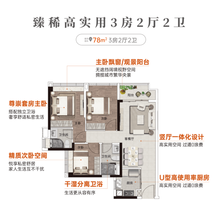 花城云著建面约78㎡的户型设计为带主套三房,在白云市场同等面积段中十分少见。户型方正,功能性齐全,实用性高,充分满足购房者对生活的美好畅想。这种设计既保证了居住空间的合理性,又通过主套设计提升了居住的舒适度与私密性,以有限的面积实现了舒适的三房居住体验,为购房者提供了高性价比的选择,尤其适合首次购房的年轻家庭或追求紧凑实用空间的人群。售楼处电话:400 - 828 - 5661售楼处已认证购房咨询热线