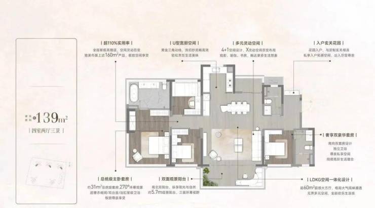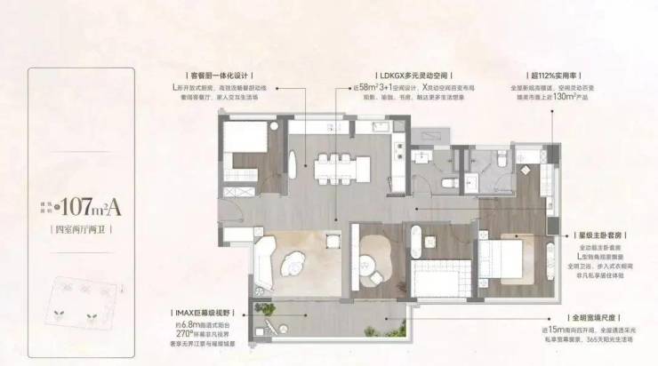 主力户型涵盖约90-142㎡的3至4房,所有户型均采用新规设计,使用率超过110%,远超市场平均水平。特别是107㎡、128㎡、142㎡等大户型,通过巧妙的空间布局与阳台赠送面积,实现了“小面积大功能”的极致体验。例如,107㎡户型可做到三房两厅两卫,实际使用感堪比120㎡以上产品,既满足刚需上车需求,也为未来家庭成长预留充足空间。