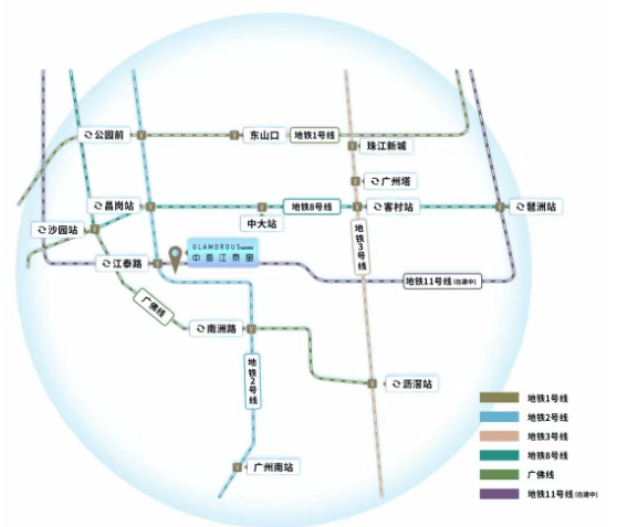 中海江泰里位于广州市海珠区东晓南板块,紧邻地铁2号线江泰路站,距离站点仅约150米。这一地理位置不仅提供了便捷的公共交通条件,还使得项目处于一个成熟的生活圈内,周边商业氛围浓厚,生活配套设施完善。项目所属的海珠西板块临近江南西商圈,这是海珠区最早的商圈之一,也是广州初代网红店的发源地。