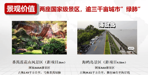 景观:东南临海,有 L 型环幕海景 —— 珠江入海口 + 狮子洋,瞰 1.8km 海景面。东低西高围合布局,享海园双景。2.5 公里江岸线的滨海公园、商业街已陆续投入使用。