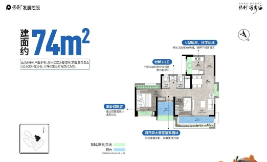 77㎡三房两厅两卫:全新升级三房,四开间朝南,超 11 米南向采光面,直面广阔园景,豪华大主卧,270 度超大角度采光。
