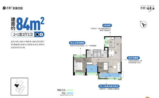 82㎡三房两卫:片区内绝版横厅小户,南北对流,LDKB 一体化设计,四开间超 11 米采光面,客餐厅开间约 5.7m,270 度超大角度采光,海园双景皆可拥有。
