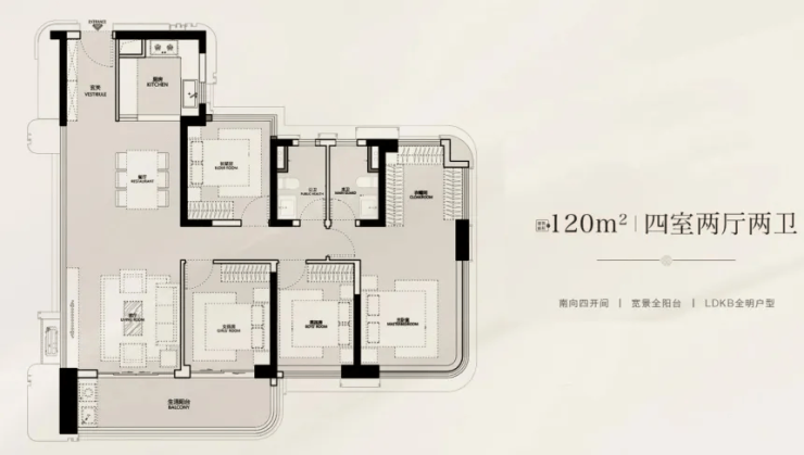 120㎡三房:全南向布局,主卧带飘窗,总价约1032万起,小家庭上车优选;