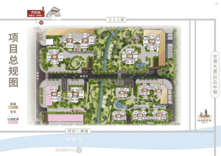 景观资源是该项目的另一大吸引点。项目临近流溪河生态带。流溪河属于广州北部重要水系生态轴,区域空气湿度与负氧离子浓度相对较高。城市生态住宅通常采用“水系+绿地”双重景观逻辑。社区内部规划约4万㎡中央园林景观系统,采用多层次植物配置与步行景观路径设计,使居住体验更偏向度假型社区。