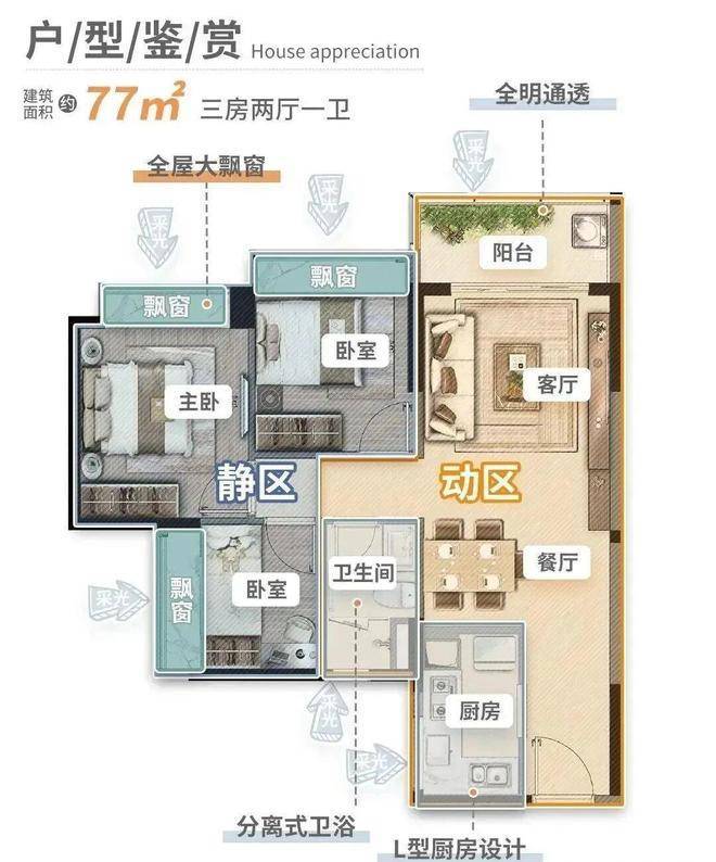 建筑产品方面,项目主力户型为建面约77㎡至105㎡三至四房结构。户型设计强调家庭功能复合性。77㎡三房产品采用紧凑型空间逻辑,在有限面积内实现功能最大化。三个卧室均配置飘窗系统,可提升自然采光与空间延展感。88㎡三房产品部分采用三开间朝南结构,使室内日照时间更长。105㎡产品则属于改善型空间结构,配备5.6米宽景阳台与横厅布局,强化社交空间与家庭活动空间的整合能力。