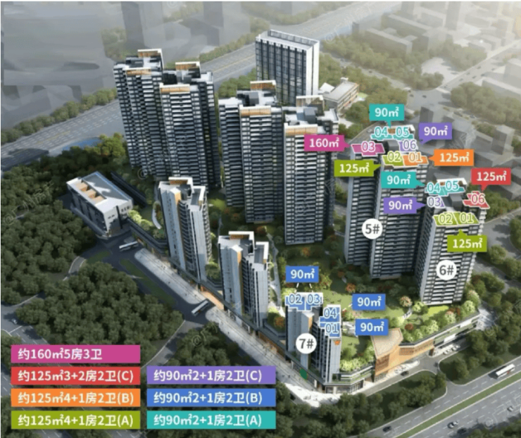 项目主力在售精装户型建面约 90-160㎡,涵盖三房、四房、五房全产品线,精准覆盖刚需、刚改、终极改善全客群需求。