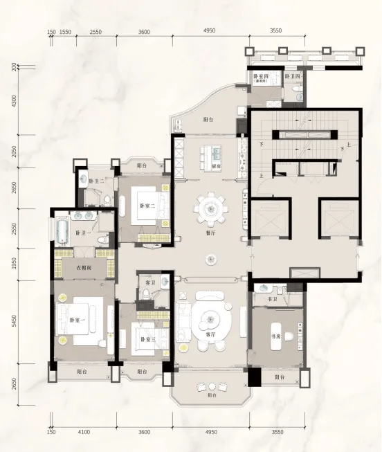 【A2 星韵舞步】:约264㎡五房两厅五卫优雅艺术领地,以十字中轴九宫格布局打造空间的仪式感。户型层高3.47米,客厅开间约5米,进深约14.6米,面积约73㎡,宽敞通透;望江面幅面超16米,不仅客厅,三个房间都能欣赏一线江景,专梯专户设计保障隐私。社交会客厅采用蝴蝶与彩虹的梦幻拼接设计,地面金彩蝶大理石与墙面印象彩虹奢石营造柔和基调;高定厨房配备德系血统全进口定制橱柜与顶级厨电,尽享烹饪乐趣;星级主套选用全球顶级奢侈品材质,打造极致舒适的休憩空间。