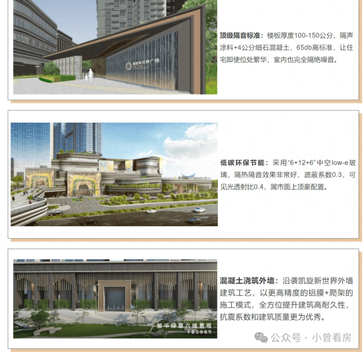 绿色建筑:绿建三星+LEED金级双认证,应用海绵城市系统(屋顶绿化+雨水回收),6+12+6双层中空Low-E玻璃+现浇外墙,隔音隔热优于普通住宅。