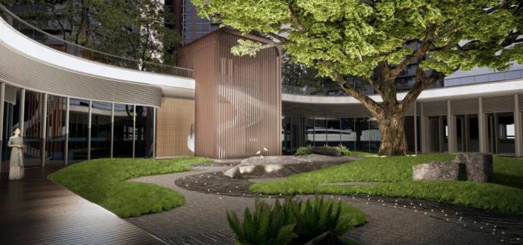 小区内规划古榕云岛、清茵翠庭、流石堂瑞等四进仪式归家动线,围绕百年古榕打造下沉式会所,设置儿童天地、活力健身、休闲会客三大主题架空层,构筑高品质精奢园林空间