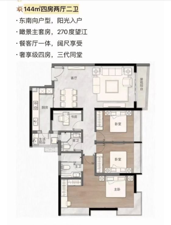 144㎡四房两厅两卫:东南向户型,阳光充足,入户即享开阔视野,270度望江设计,推窗即可将珠江盛景、广州塔、东西塔等城市地标尽收眼底,是项目的标杆户型。餐客厅一体设计,阔尺空间,搭配大阳台,采光通风俱佳,既能满足家庭日常起居,也能容纳亲友聚会,彰显主人的格调与品味。瞰景主套房设计,配备独立卫浴与衣帽间,私享静谧空间,保障主人的私密性与舒适度;其余三个卧室均方正宽敞,采光充足,可根据需求打造为儿童房、老人房、书房等,满足三代同堂的居住需求。客卫采用三分离设计,干湿分离,使用便捷,避免拥挤,让家人的生活更有序。