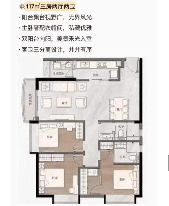 117㎡三房两厅两卫:户型方正,布局合理,双阳台向阳设计,美景与采光入室,视野开阔,无界风光尽收眼底。主卧奢配衣帽间与独立卫浴,私藏优雅,保障主人的私密性与舒适度;两个次卧方正宽敞,采光充足,可满足孩子、老人的居住需求。餐客厅一体,空间开阔,连接阳台,通风采光俱佳,打造舒适的起居空间;客卫三分离设计,干湿分离,使用便捷,提升居住体验。该户型兼顾实用性与舒适度,适合改善型三口之家居住。