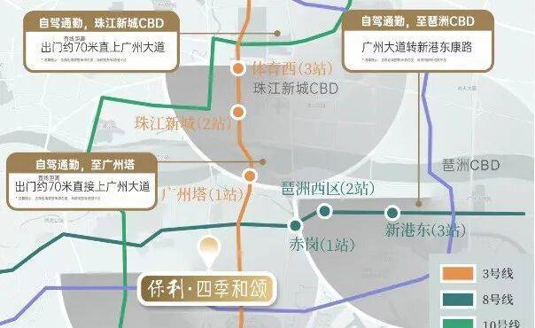 在城市生活中,交通的便利性直接决定了日常通勤的效率与生活的幸福感。保利・四季和颂周边坐拥 3 号线、8 号线、10 号线、11 号线四条地铁线路交汇,形成了四通八达的地铁交通网络,能够极速通达广州全城各个核心板块。从项目出发,1 站即可直达广州塔,2 站便可抵达珠江新城 CBD,3 站就能速达琶洲西区,无论是去往珠江新城上班,还是去琶洲参会,亦或是去广州塔休闲游玩,都能通过地铁快速抵达,彻底告别长距离通勤的烦恼。