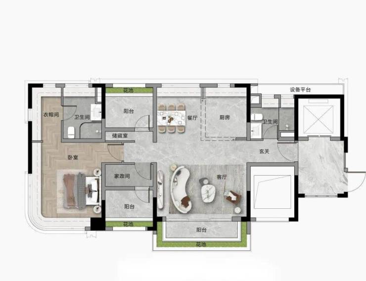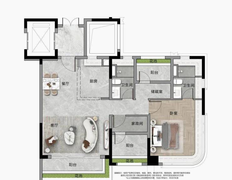 建面约 120㎡的四房户型,是专为进阶改善家庭打造的高性价比王牌产品,在有限的面积内,实现了空间利用率、居住舒适度、功能完整性的完美平衡,是片区内改善型家庭的首选户型。该户型同样采用了专梯专户的设计,电梯直达入户,为业主打造了专属的入户空间,归家仪式感拉满,带来了堪比豪宅的非凡居住体验,同时也拓展了实际的使用空间,让空间利用率得到了进一步的提升。