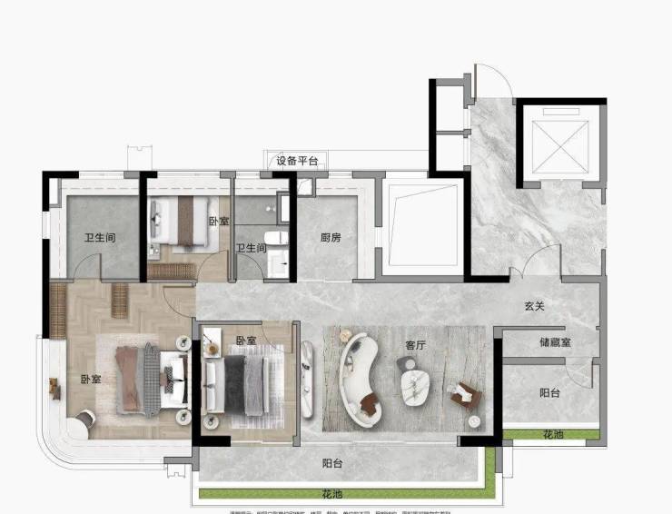 在户型布局上,该户型做到了南北通透,双视野景观,全屋的通风效果极佳,同时四个房间的布局合理,做到了完美的动静分离,公共活动区域与私密休息区域互不干扰,既保证了家庭公共活动的便利性,又保障了休息空间的私密性。四个房间的设计,能够完美适配二胎家庭、三代同堂的居住需求,也可以根据家庭需求,将其中一个房间打造为独立书房、健身房、茶室等功能空间,灵活适配家庭不同阶段的居住需求,是片区内超高性价比的改善首选户型。
