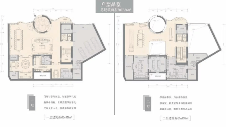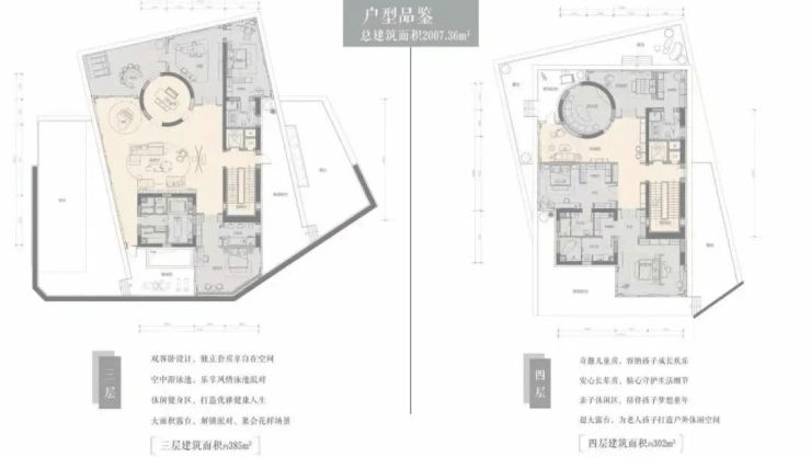 上院:建面约160㎡,7.5米超宽横厅,使用面积约300㎡,赠送屋顶花园,适合追求空中庭院生活的高净值家庭;