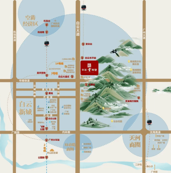 华远·雲和墅不仅占据自然资源的制高点,更身处城市发展红利的核心区。项目毗邻地铁14号线白云东平站,10分钟直达白云新城CBD,20分钟通达广州白云国际机场,30分钟内无缝连接天河、越秀等传统市中心,真正构建“半小时湾区生活圈”。
