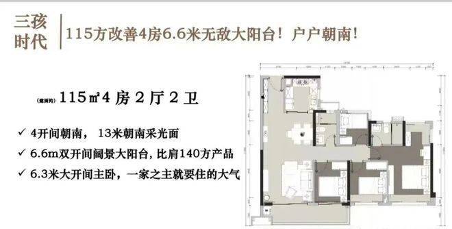在户型方面,86平方米三房两厅两卫的户型是刚需家庭的理想选择。入户玄关设置合理,为生活增添私密缓冲区;约5.6米的大阳台采光广阔,为室内带来充足自然光;主卧采用套房设计,并配备大面积双飘窗,保证私密性的同时提升采光与通风效果。95平方米三房两厅两卫户型延续竖厅布局,餐客厅与阳台连通,开间可达4.5米,空间感宽敞。主卧双面窗设计,增强通透性,同时赠送面积丰富,实用率高达九成以上,为家庭生活提供灵活空间。115平方米四房两厅两卫户型则专为改善型客户打造,动静分区明确,主卧配备三开窗及独立衣帽间,确保生活私密性和舒适度。6.6米大阳台与次卧相连,不仅提升采光,也拓展观景视野,满足全家人的生活需求。