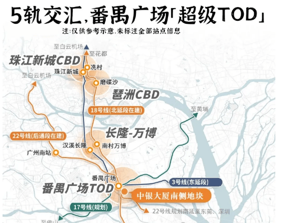 2. 多维交通枢纽加持:项目为番禺广场地铁站E口地铁上盖,汇聚3号线、18号线、22号线等多条地铁线路,其中18号线、22号线时速高达160KM/时,能快速通达天河、海珠、南沙等核心区域及广州南站、白云机场等交通枢纽,30分钟内可抵达市内核心CBD,大湾区一小时生活圈轻松实现,交通便利性无可替代。