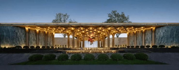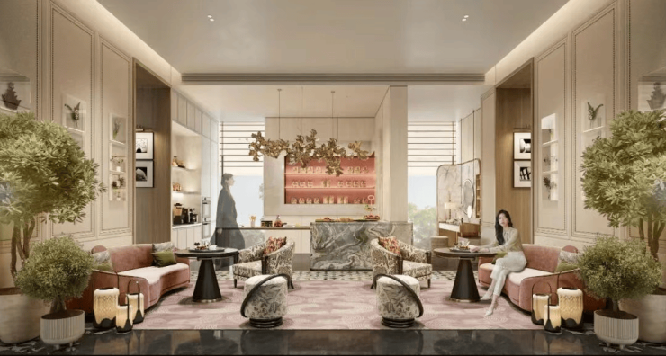 在社区景观与休闲配套方面,项目打造了约50米“玉见海棠”府门,四株全冠移植铁冬青与麻楝巍然矗立,两侧维多利亚绿宝石石壁设计,尽显恢弘气度。宝格丽酒店式下沉式大堂,搭配金色格栅与水刀拼花的典雅地面,营造出奢雅质感。风雨连廊“静揽流光”贯穿社区,一侧是水景山石,一侧是功能空间,让归家之路成为一场艺术享受。此外,项目还在架空层3层打造了空中花园,业主可在此露营、围炉煮茶、观看户外电影,尽享惬意时光。