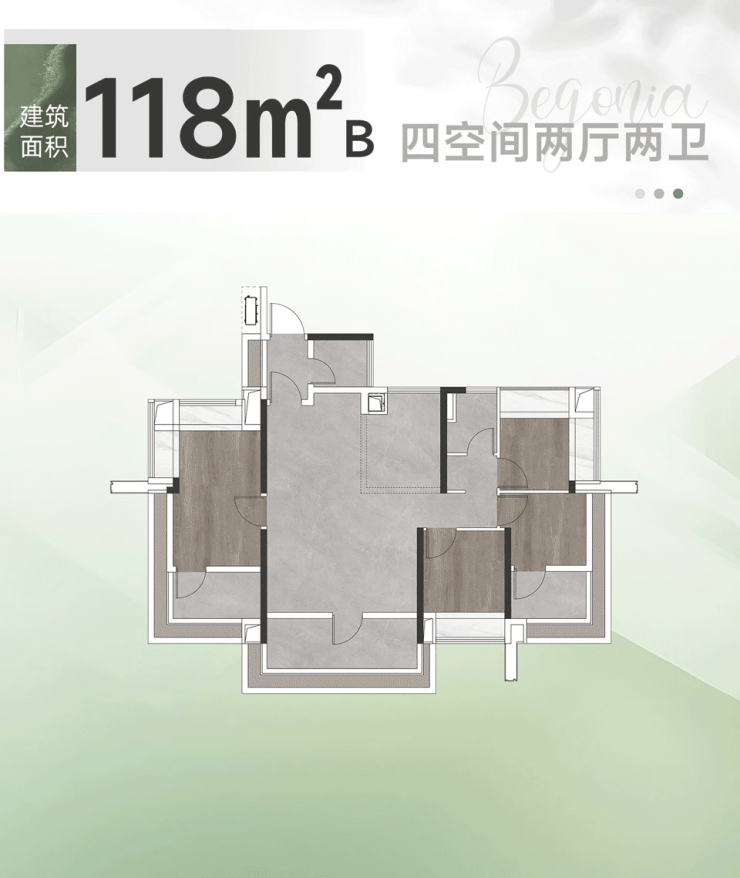 建面约118㎡四房两厅两卫B户型:该户型堪称“王牌户型”,进门即配备专属玄关柜和独立家政区,收纳空间充足,归家仪式感满满。户型南向面宽约15米,南北通透,穿堂风顺畅,能有效改善广州潮湿的居住环境。主卧配备270°环幕飘窗,视野开阔,可尽览室外美景;次卧也能直接欣赏到番禺中央公园景观,景观资源优越。