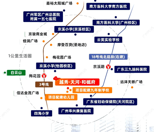 越秀天河和樾府坐落于天河天河北板块,占据广州城市中轴关键位置,直线距离珠江新城仅 5 公里,轻松串联广州大道北、天河北、珠江新城等繁华商圈,同时临近金融城、智慧城两大产业中心与越秀东部区域,无论是通勤还是日常出行都十分便捷。交通方面,项目距离地铁 3 号线梅花园站直线约 400 米,步行约 13 分钟即可抵达,搭乘地铁 4 站直达珠江新城,无需换乘;在建的 18 号线北延段京溪路站(预计 2026 年底通车)也紧邻项目,未来前往珠城、琶洲等地将更高效。自驾出行同样便利,周边有广州大道北、沈海高速等交通线路,非高峰时段 30 分钟内可抵达金融中心,极大提升了业主的出行效率。