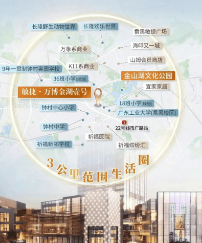 敏捷万博金湖壹号位于广州市番禺区的万博CBD核心区域,紧邻番禺最大的湖泊——金山湖。该项目由拥有30余年历史、在珠三角城市群及全国范围内布局超过100个精品项目的敏捷集团精心打造。总占地面积约7.45万平方米,建筑面积约23.98万平方米,首期包括10栋27-31层高的住宅楼,提供从95平方米至146平方米全南向低密度湖居作品。项目以“城市级湖居”为设计理念,致力于为居民提供一个融合繁华都市与自然美景的理想居住环境。