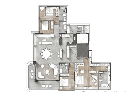 户型布局上,采用LDK四联聚厅设计,将客厅、餐厅、厨房与观景阳台融为一体,不仅提升了空间的通透感与采光度,更营造出温馨的家庭共融空间。纯享式厅级主卧配备恬谧私厅与观江浴缸,双向纵揽珠江风情,为业主打造极致私密的尊享空间。