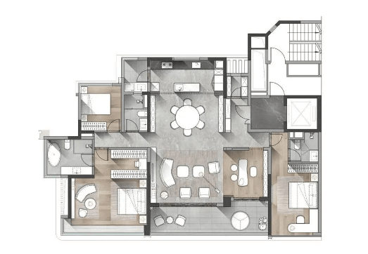 中海映澜台目前在售的户型为203㎡和246㎡的四房大平层产品,均为南向江景户型,整体户型设计极致贴合江景资源的利用,打造全明通透、视野开阔的居住空间。