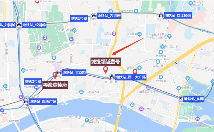 交通:距地铁6号线团一大广场站约300米(步行4分钟),2站达北京路,3站达海珠广场(换乘2号线);自驾紧邻东华北路、文明路,10分钟达天河CBD,20分钟达白云新城;
