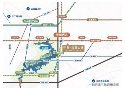 首先是在陆路交通方面,项目紧邻松佛路,这条主轴贯通松山湖与大朗中心,不仅是上下班高频使用的快速通道,更是产业集群的黄金动脉。此外,莞深高速与莞佛高速双高速环绕,使得住户可快速到达深圳福田CBD、广州天河CBD等核心区域,实现跨城市通勤也不再是难事。随着城市间通勤需求不断增加,交通效率将成为评价一个区域价值的重要指标,而松湖东岸恰恰具备这样的先天条件。