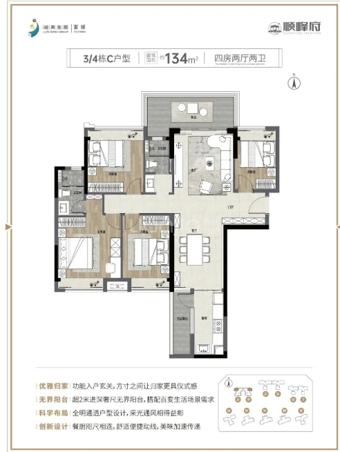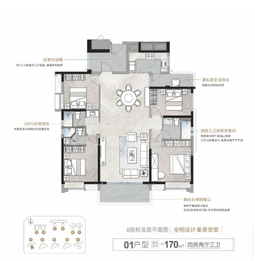 项目全系改善户型格局方正,动静分区合理,得房率处于片区中上水平,空间利用率高。户型覆盖刚需改善到终极改善,大面宽阳台、南北对流、套房设计齐全,部分楼王户型拥有专属入户空间与全景景观,居住尺度与舒适度表现优异。