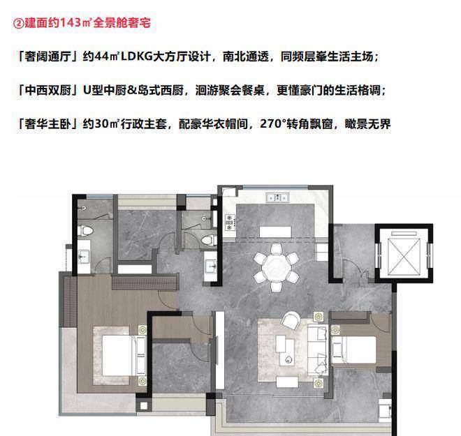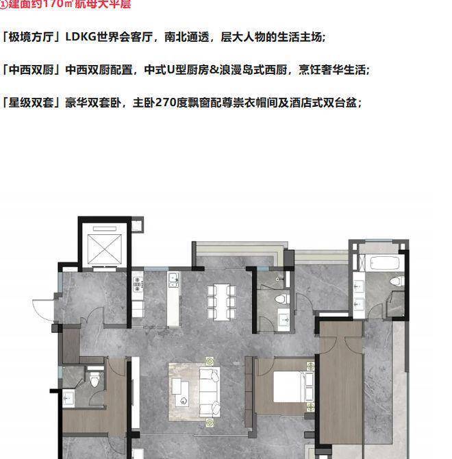 产品为 107 - 170㎡全景舱板奢大平层,新规户型使用率高达 115%,且为纯改善四房,全板式楼盘,确保 100%南北对流和 100% 四开间朝南。项目在规划设计上摒弃单纯追求收益的常规做法,而是专注于品质打造,最终呈现出纯南向板楼社区。约 55 米楼间距超越 50 米的标准,最大化每栋楼的视线和面宽,保障业主隐私,提供最佳视野景观。建面约 170㎡户型打造 “极境方厅”,LDKG 世界会客厅尽显层大人物生活主场;建面约 143㎡户型的 “奢阔通厅” 约 44㎡,同频层峯生活;建面约 107㎡户型以 “极致面宽” 四开间朝南,纵享豪宅尺度。