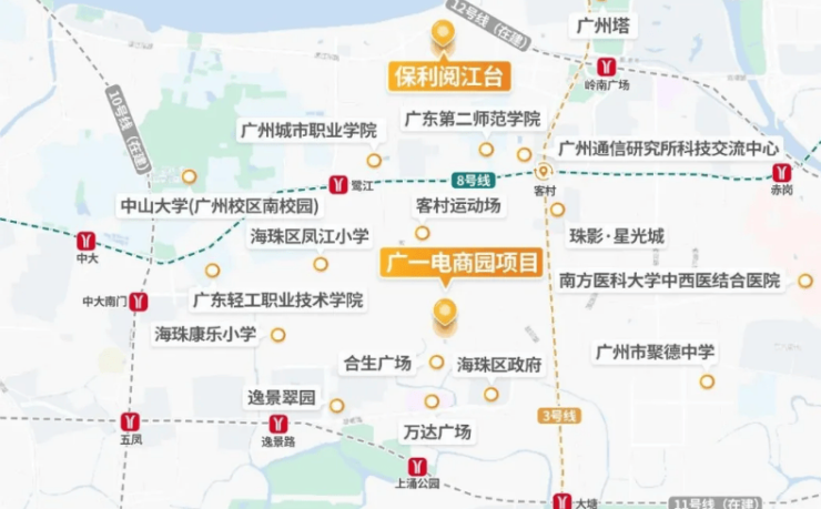 项目位于广州大道南,广一电商园南侧,这里是连接天河CBD与海珠南部片区的咽喉要道。左手是成熟的老城烟火,右手是蓬勃发展的琶洲数字经济区。这种独特的地理位置,使得项目能够同时享受老城的便利配套与新城区的产业红利。广州大道南作为城市中轴线的重要组成部分,不仅是交通大动脉,更是资源汇聚的走廊。沿着这条轴线,顶尖的资源、高端的产业、优质的教育、完善的医疗如珍珠般散落,而海珠保利四季和颂,正是这颗链条中最耀眼的一环。