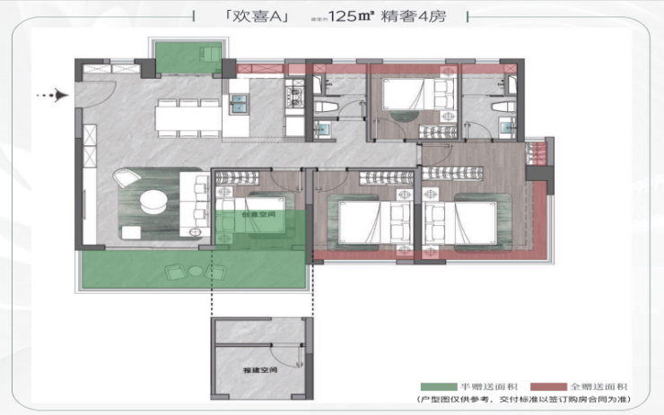 如果说地段是骨架,产品才是灵魂。保利灯湖天珺二期珺樾组团主推的建面约125㎡创意四房,正是以“新规红利+极致空间”赢得市场热捧。得益于佛山2024年实施的新版住宅设计规范,该项目实现约106%的惊人使用率,远超传统90%左右的平均水平。约65㎡的LDK一体化社交巨厅,搭配6.6米大开间,打破墙体束缚,营造出堪比改善级产品的开阔感。四个卧室均具备实用功能,最小次卧也能轻松容纳1.5米床+衣柜,彻底告别“书房式小房”的尴尬。南北双阳台设计,既保障通风采光,又提供观景与生活分区。近期推出的年终专场活动中,该户型总价约290万元起,折合单价约2.3万/㎡,对比千灯湖核心区动辄3万+/㎡的价格,性价比优势显著。据悉,139㎡四房新品也即将加推,进一步满足多代同堂家庭的空间进阶需求。