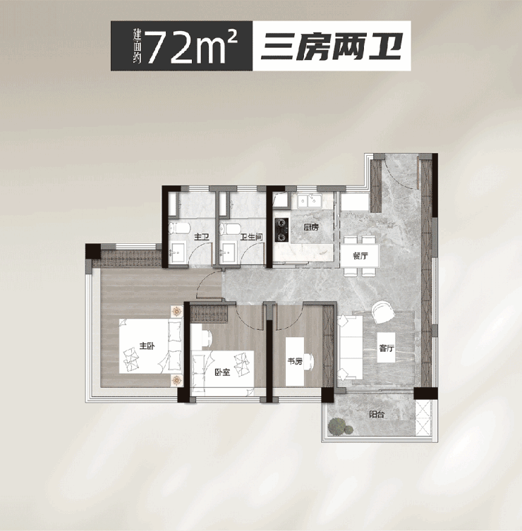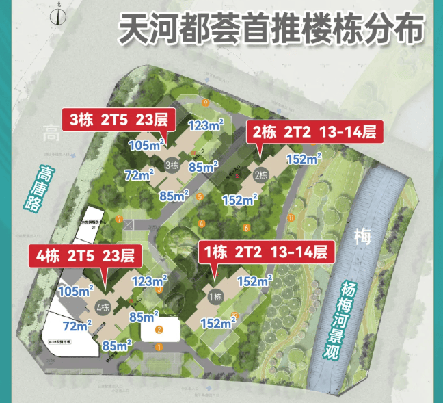 北地块 1 栋、2 栋为 13 - 14 层的小高层,2T2,靠近杨梅河,安静舒适;3 栋、4 栋是 23 层的高层住宅,2T5,与火炉山公园相邻。南地块共 8 栋,1 - 4 栋总高 15 层,2T3 户;5 - 8 栋总层高 32 层,户型建面约 72 - 85 - 105 - 123 平。