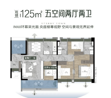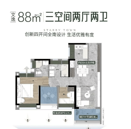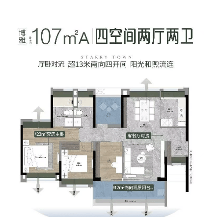 在售建面约 88 - 125㎡三至五空间,户户朝南,270° 宽景大阳台,4 - 4.5 面宽朝南,使用率高。如 88㎡户型罕见四面宽,三卧室朝南;107㎡户型配置南向观景玄关,客厅主卧双南北对流;125㎡户型 4.5 开间朝南,客餐厅南北对流,餐客一体化设计满足多样生活需求。