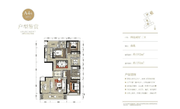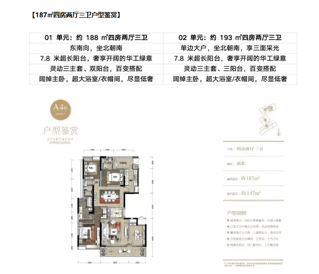 目前在售的主要是A4栋,主打187㎡和192㎡两种四房两厅三卫户型。这些户型设计宽敞明亮,功能分区清晰合理,特别适合多孩家庭或三代同住的家庭结构。尤其是192㎡户型,采用东南单边大户设计,主卧配有衣帽间和卫生间,私密性和奢华感兼具,同时灵动三阳台的设计让室内采光、通风效果极佳。这些精心设计的户型无疑为购房者提供了理想中的家的选择。